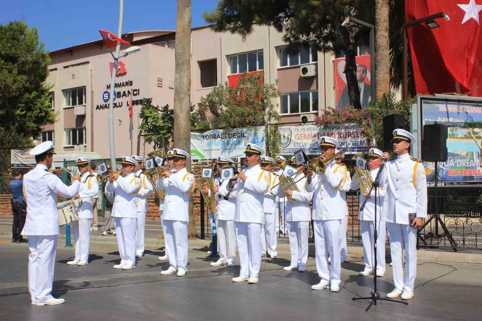 Aksaz Deniz Üs komutanlığı askeri bandosu eşliğinde saygı duruşu ve İstiklal Marşı’nın okunmasının ardından, Cumhurbaşkanı Recep Tayyip Erdoğan’ın mesajı okundu. Silahlı Kuvvetler adına günün anlam ve önemine binaen yapılan konuşmanın ardından,şiirler okundu, Aksaz Askeri Bandosu konseri ile devam eden tören Jandarma, Aksaz Deniz üssü, Emniyet personeli, okullar ve spor kulüplerinin katıldığı geçit töreni ile sona erdi.