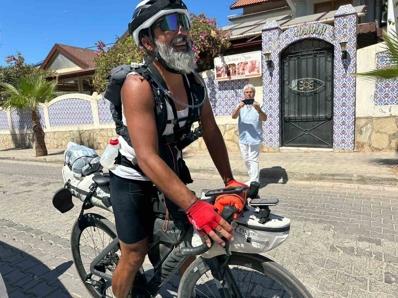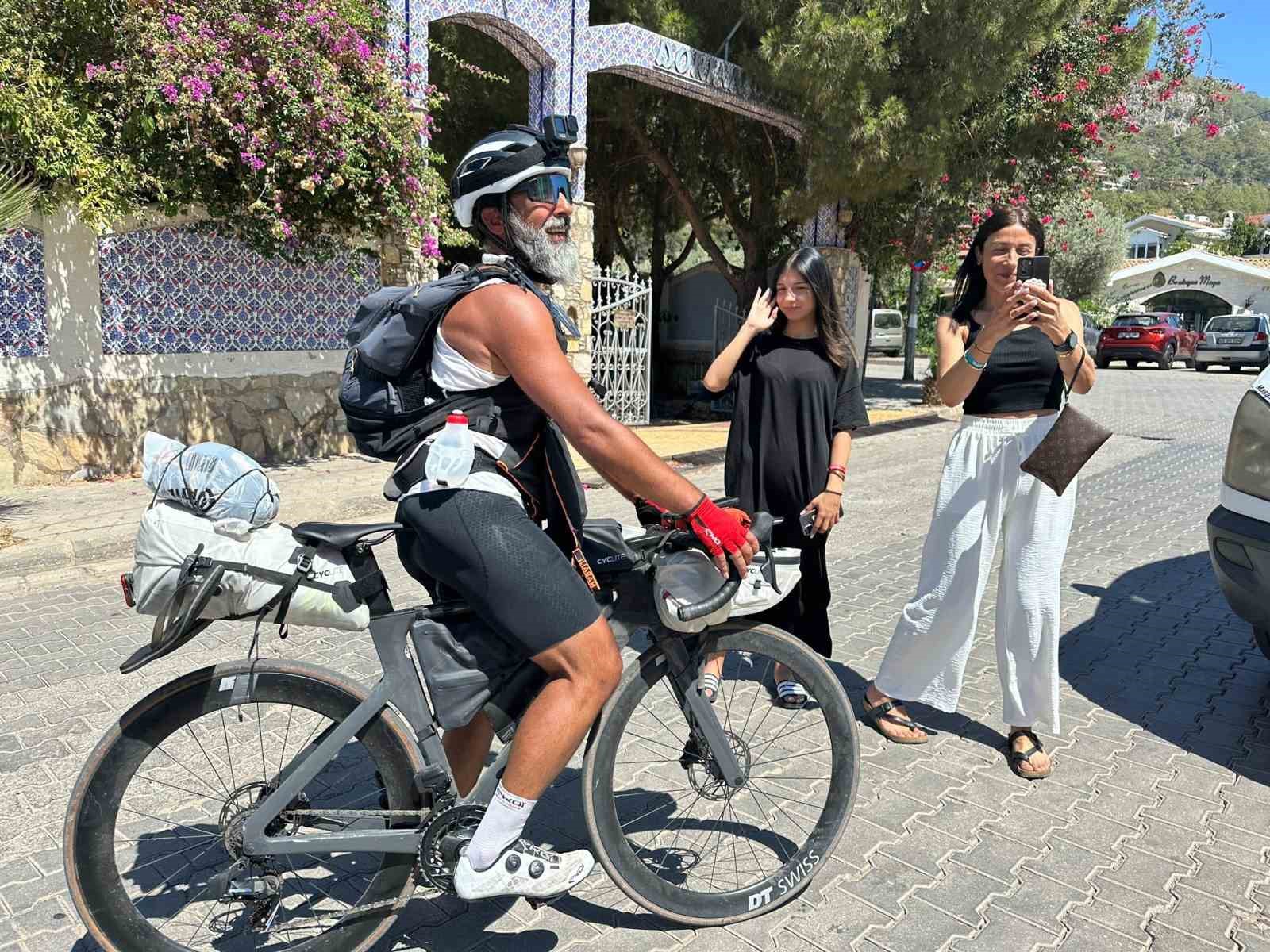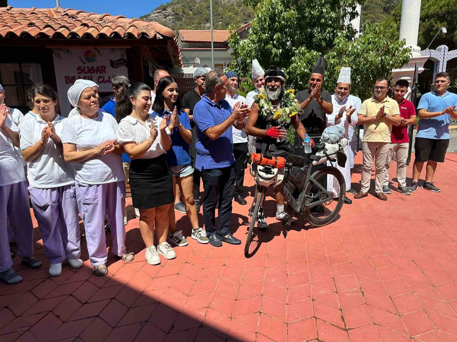 Almanya’nın Hamburg kentinde yaşayan Ender Kurtoğlu, 3 bin 500 kilometre pedal çevirerek bisiklet ile 8 günde Muğla’nın Fethiye ilçesine geldi.