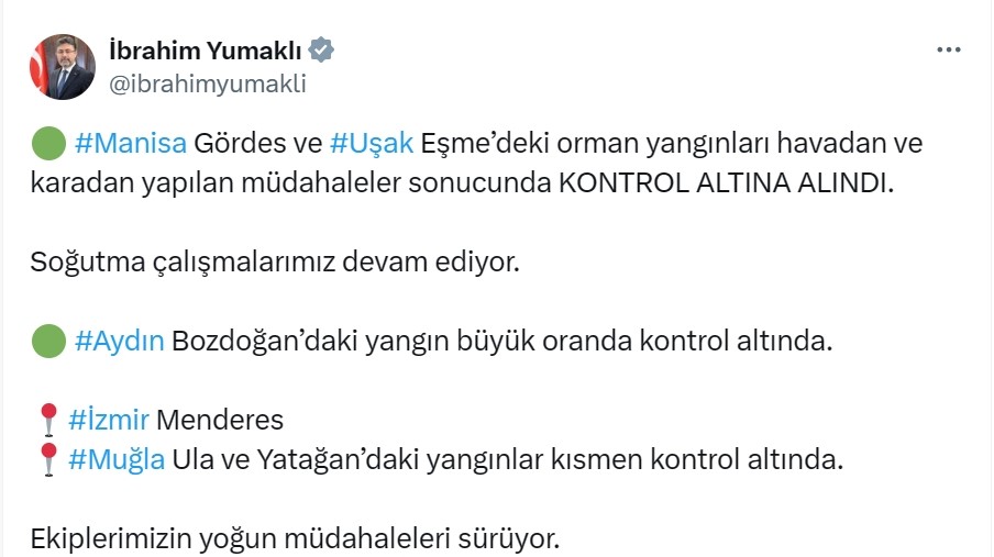 Tarım ve Orman Bakanı İbrahim Yumaklı sosyal medya hesabından yaptığı açıklamada Muğla’nın Ula ve Yatağan ilçelerinde meydana gelen orman yangınlarının ekiplerin yoğun çalışmaları sonucu kısmen kontrol altına alındığını duyurdu.