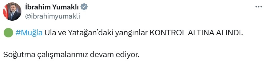 Bakan Yumaklı yaptığı paylaşımda, “Muğla Ula ve Yatağan’daki yangınlar kontrol altına alındı. Soğutma çalışmalarımız devam ediyor” ifadelerini kullandı.