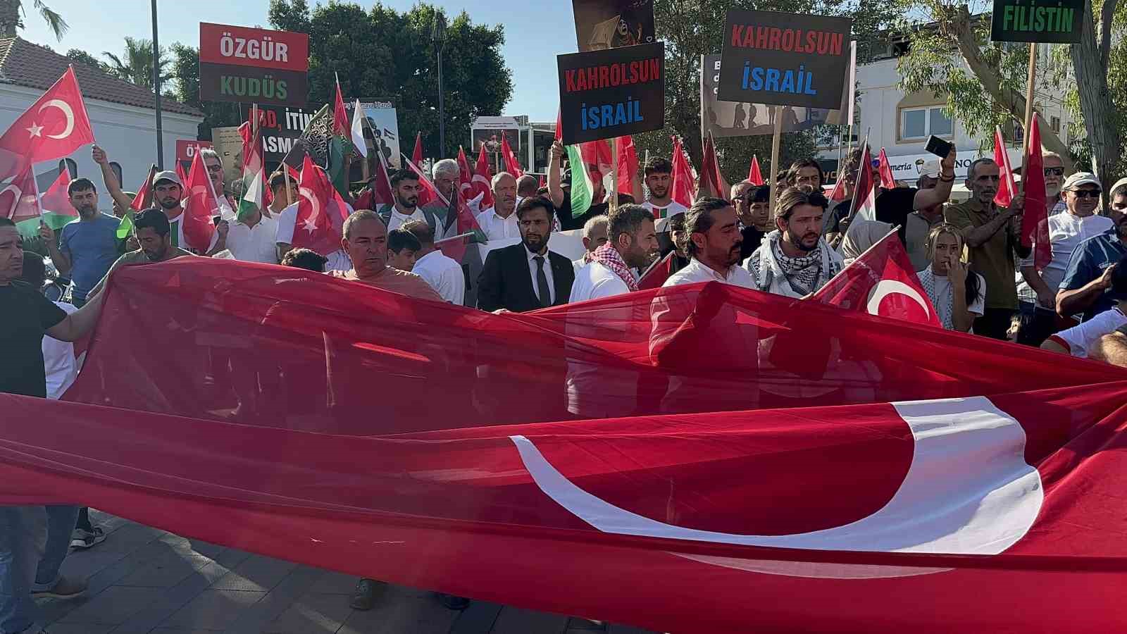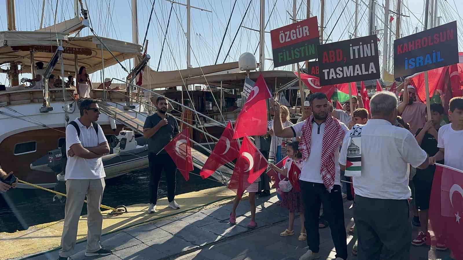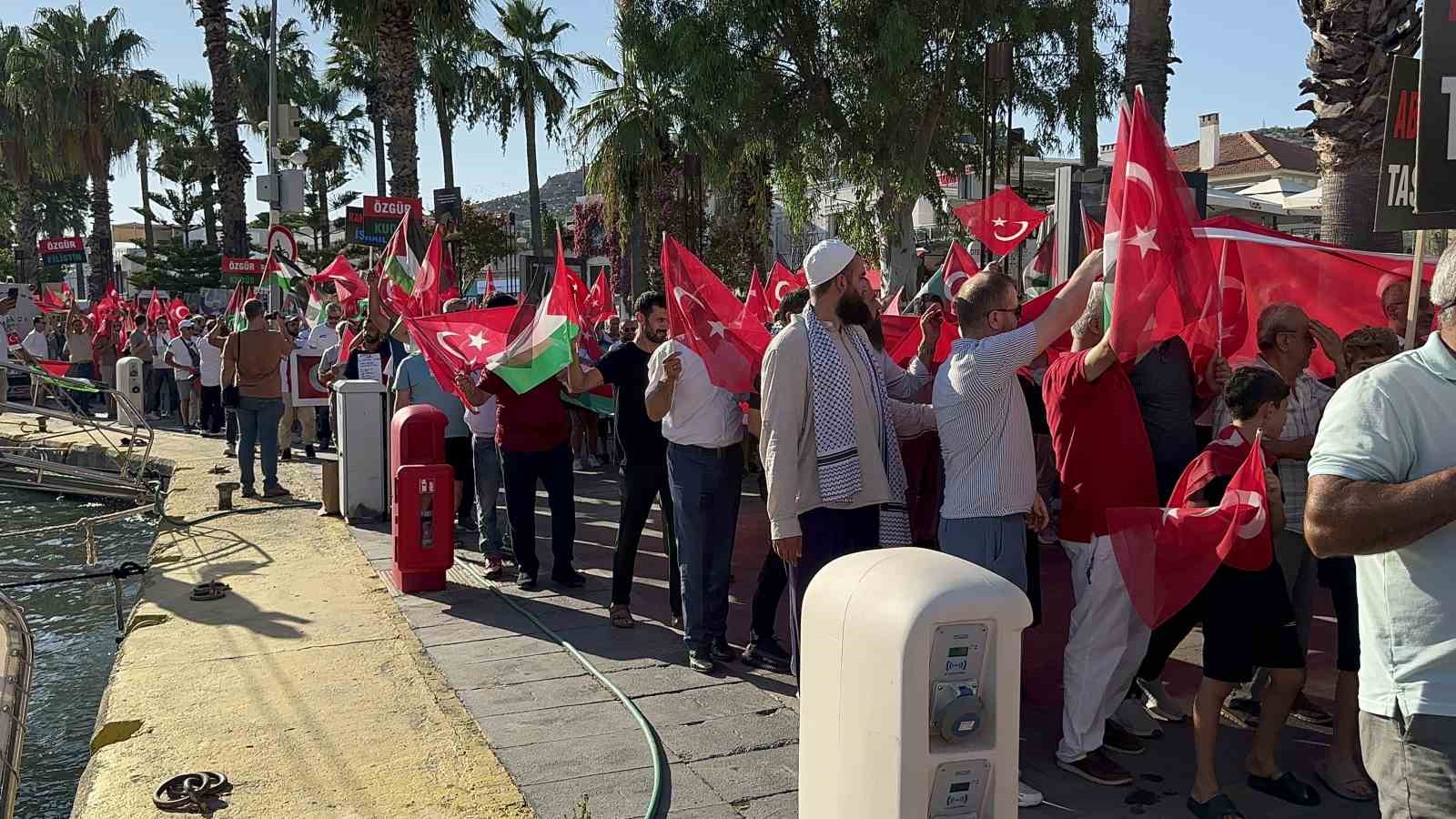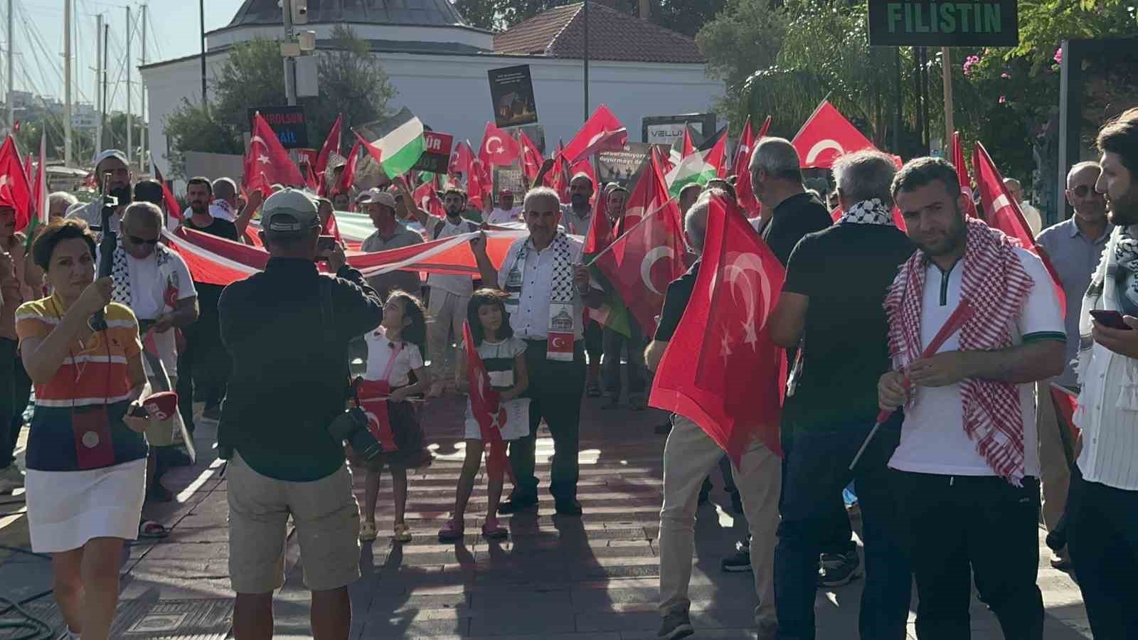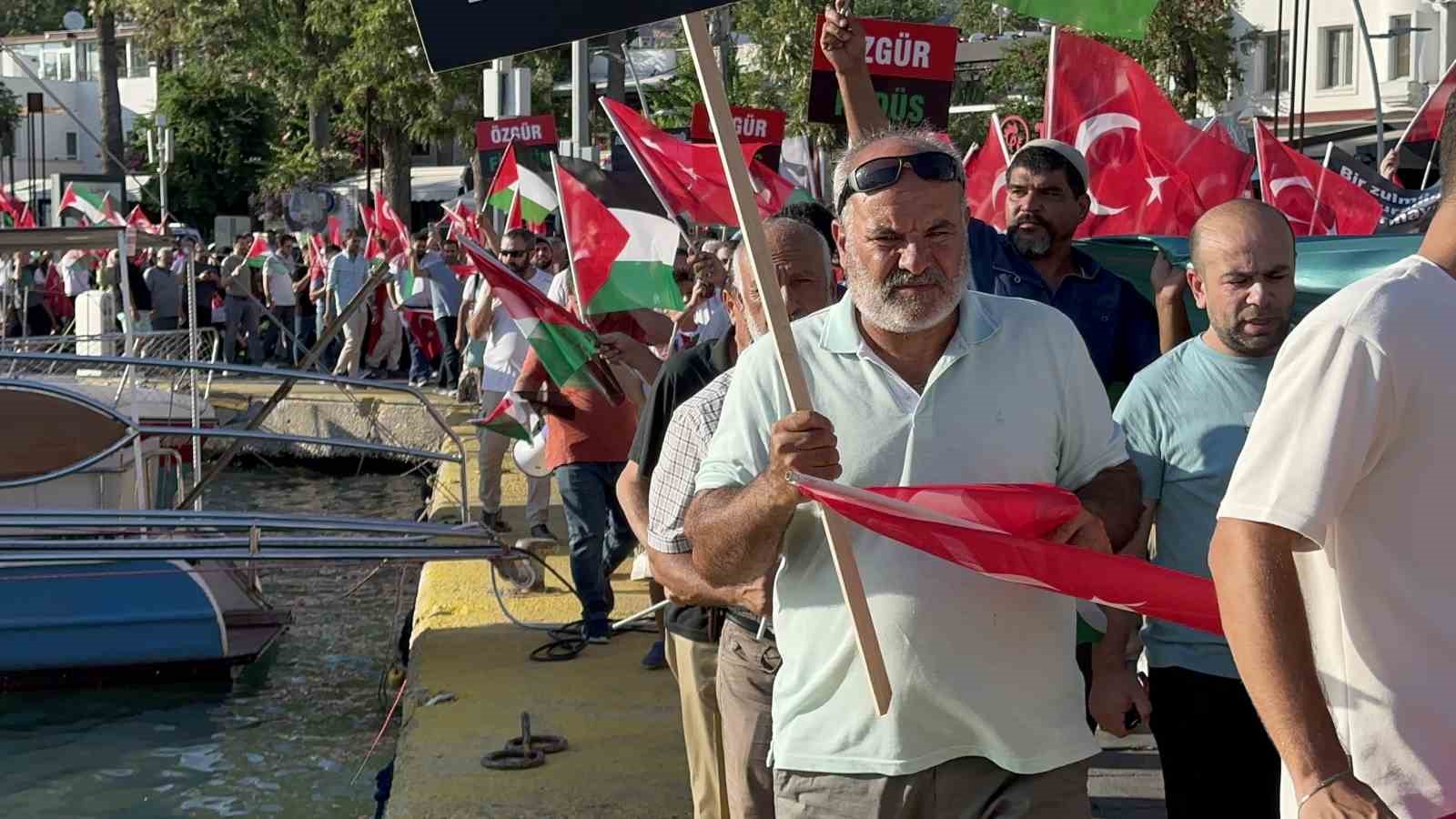 Muğla’nın Bodrum ilçesinde Gazze’ye destek vermek amacıyla geniş katılımlı bir yürüyüş düzenlendi. Turistler de yürüyüşe destek vererek İsrail’i kınadı.