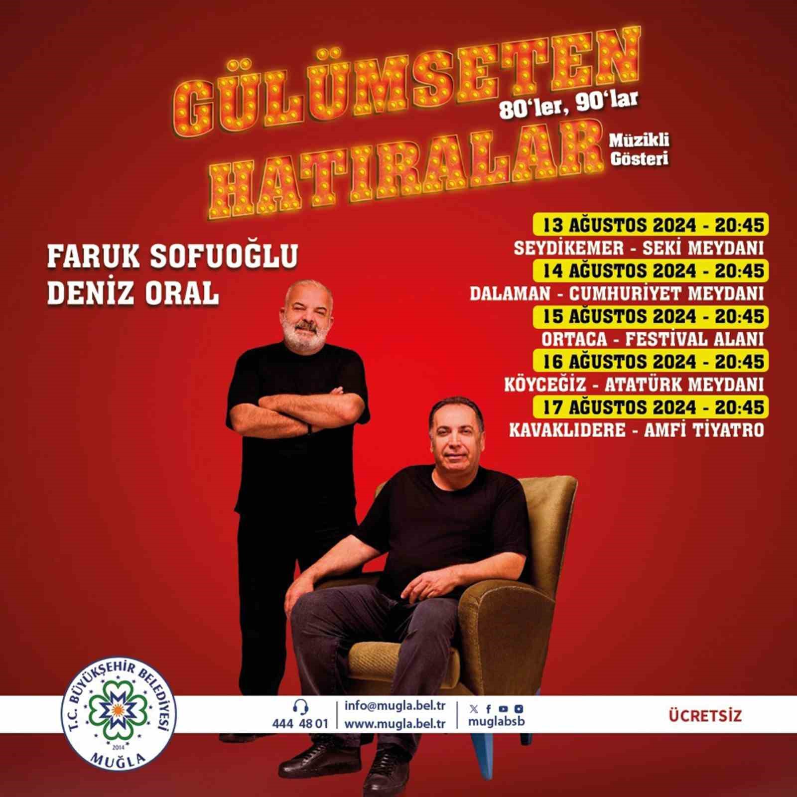 Muğla Büyükşehir Belediyesi diğer tiyatro oyunu Gülümseten Hatıralar’da ekranların tanınan isimleri Faruk Sofuoğlu ve Deniz Oral’ı vatandaşlarla buluşturacak. Sürpriz performansları, anlatıları, müzikleri ile geçmişten günümüze dokunan oyun 13 Ağustos’ta Seydikemer Seki Meydanı’nda ilk gösterimini yapacak. Gülümseten Hatıralar 80’ler, 90’lar oyunu 14 Ağustos Dalaman-Cumhuriyet Meydanı, 15 Ağustos Ortaca-Festival Alanı, 16 Ağustos Köyceğiz-Atatürk Meydanı, 17 Ağustos Kavaklıdere-Amfi Tiyatro’da izleyicisi ile buluşacak.