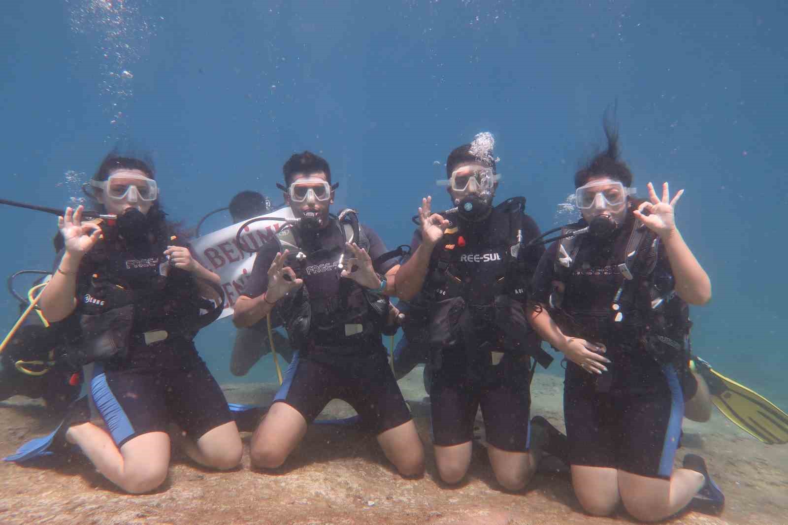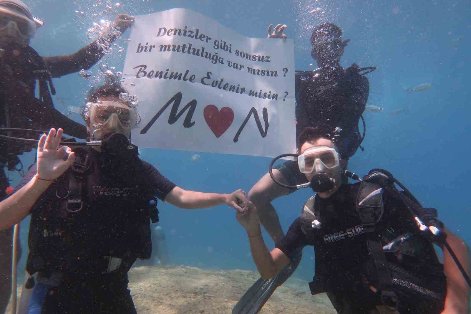İzmir’den Fethiye’ye tatile gelen tatile 2 kişi kız arkadaşlarına su altında evlilik teklifinde bulundular.