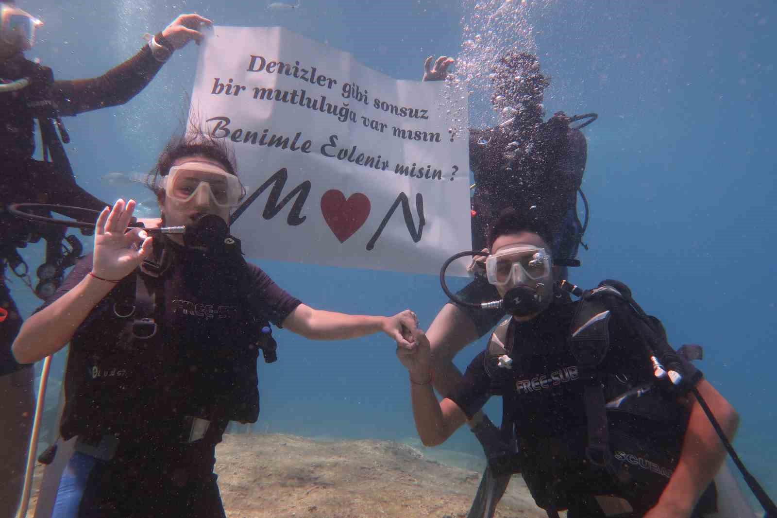 İzmir’den kız arkadaşları tekniker Kübra Kurt ve yüzme antrenörü Nazlı Basakbaskın ile Fethiye’ye tatile gelen esnaf İlker Kaba ile işletmeci Mehmet Şahin, su altında evlilik teklifi yapmak için ilçede dalış okulu işleten Önder Diktaş’a başvurdu. Tekneyle Dalyan Koyu’na açılan çiftler, dalış kıyafetleri giyerek eğitmenlerle dalış gerçekleştirdiler. İlker Kaba ile Mehmet Şahin, denizde romantik bir sürpriz yaparak kız arkadaşlarına evlilik teklif ettiler. ‘Benimle Evlenir Misin?’ pankartlarını ve yüzükleri gören Kübra Kurt ve Nazlı Basakbaskın, evlilik teklifine şaşkınlıklarını gizleyemedi. Kızlar sevinçle teklifleri kabul ederken, rengarenk balıklar arasında erkek arkadaşlarına sarıldılar. Su altında gerçekleşen evlilik teklifi anları, su altı kamerasıyla kaydedildi.