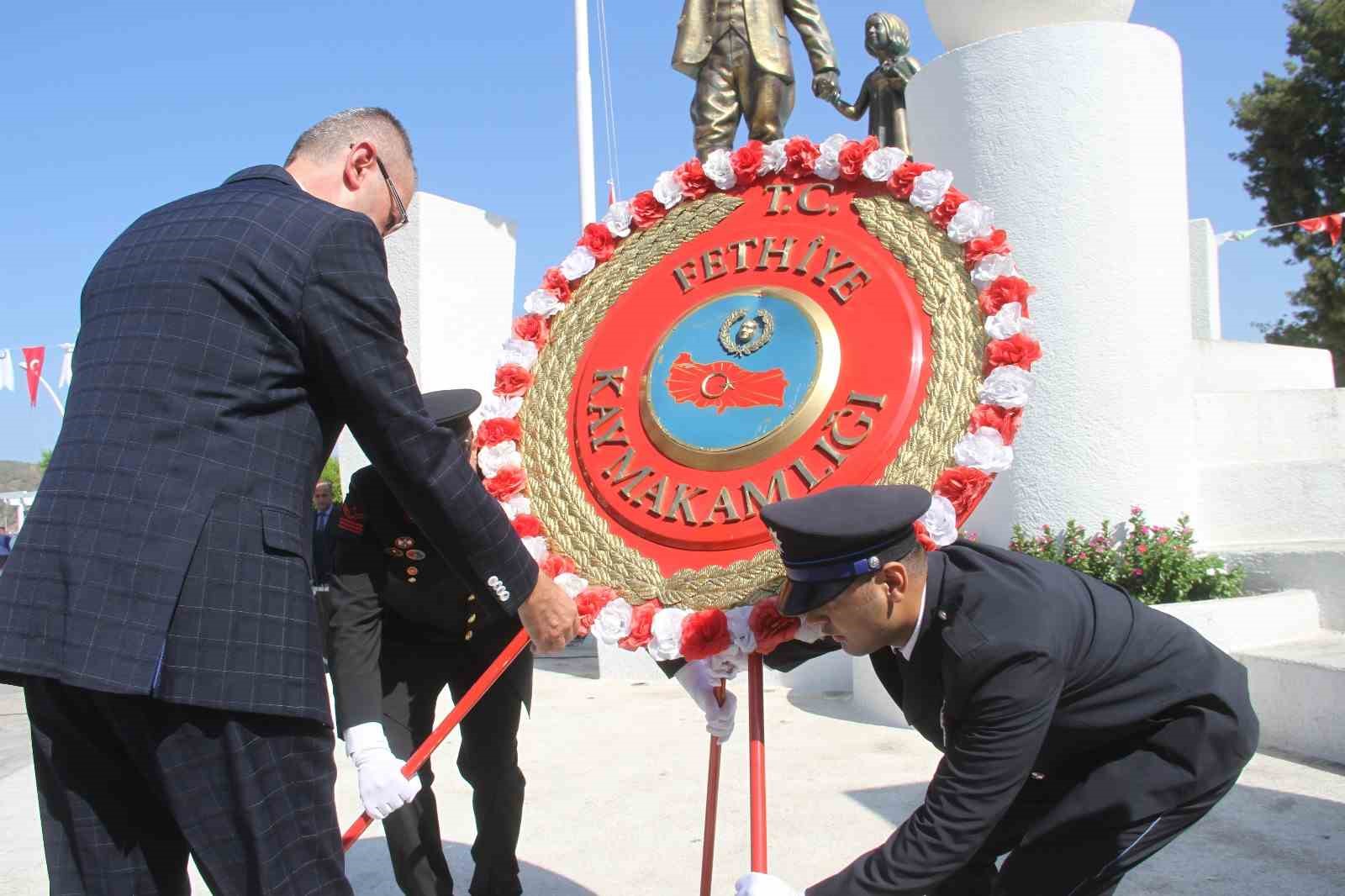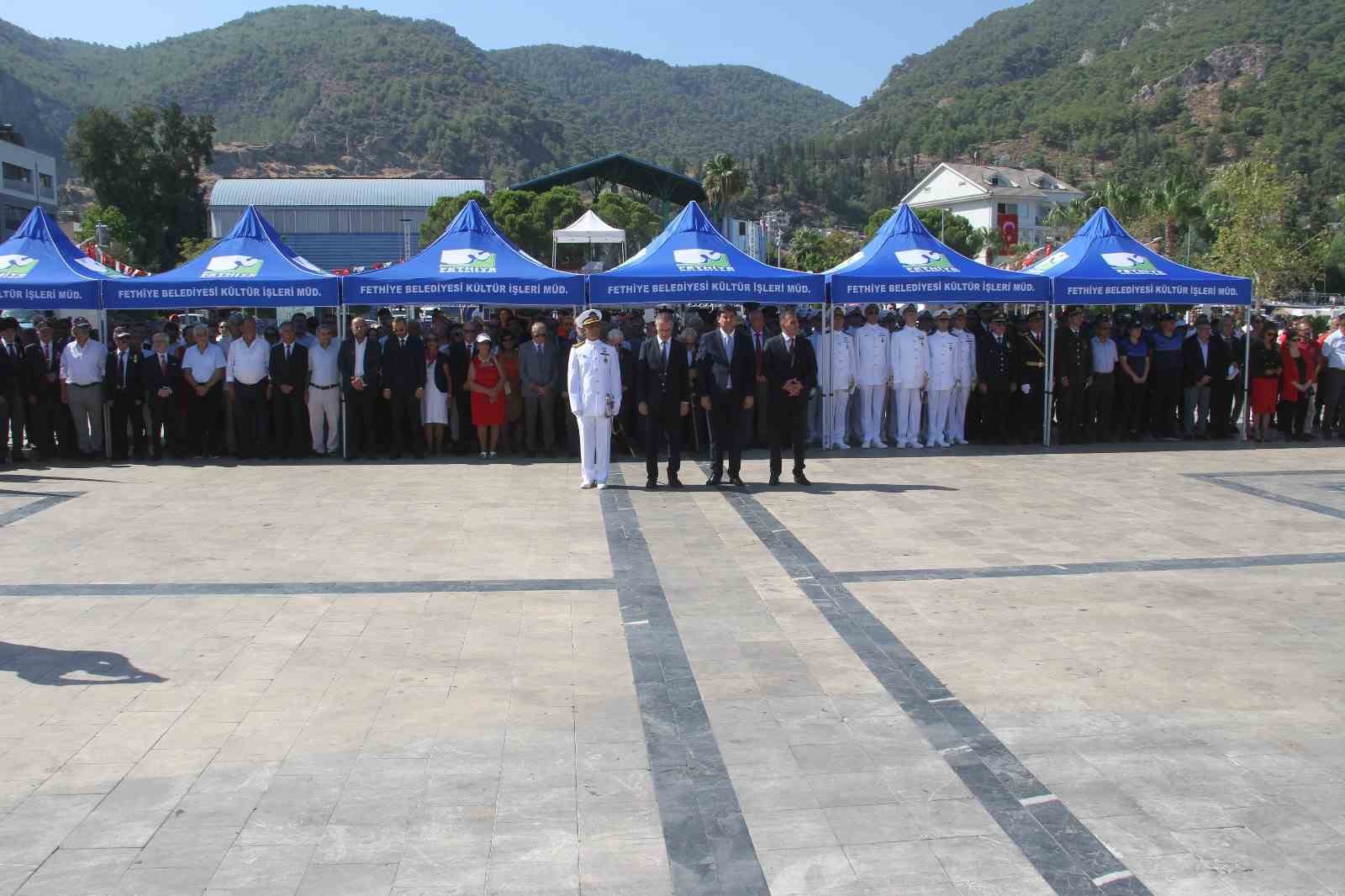 Beşkaza Meydanı Atatürk Anıtı önünde gerçekleşen çelenk sunma merasimine Fethiye Kaymakamı İsmail Hakkı Ertaş, Garnizon Komutanı Dalaman Deniz Hava Üs Komutanı Deniz Albay Ahmet Emre İnal, Cumhuriyet Başsavcısı Günşafak Karartı, kurum müdürleri, siyasi parti ilçe başkanları, STK temsilcileri ve vatandaşlar katıldı. Törende ilk olarak Fethiye Kaymakamlığı, garnizon komutanlığı ve belediye çelenkleri anıta sunuldu. Ardından saygı duruşunda bulunulup, İstiklal Marşı okundu.