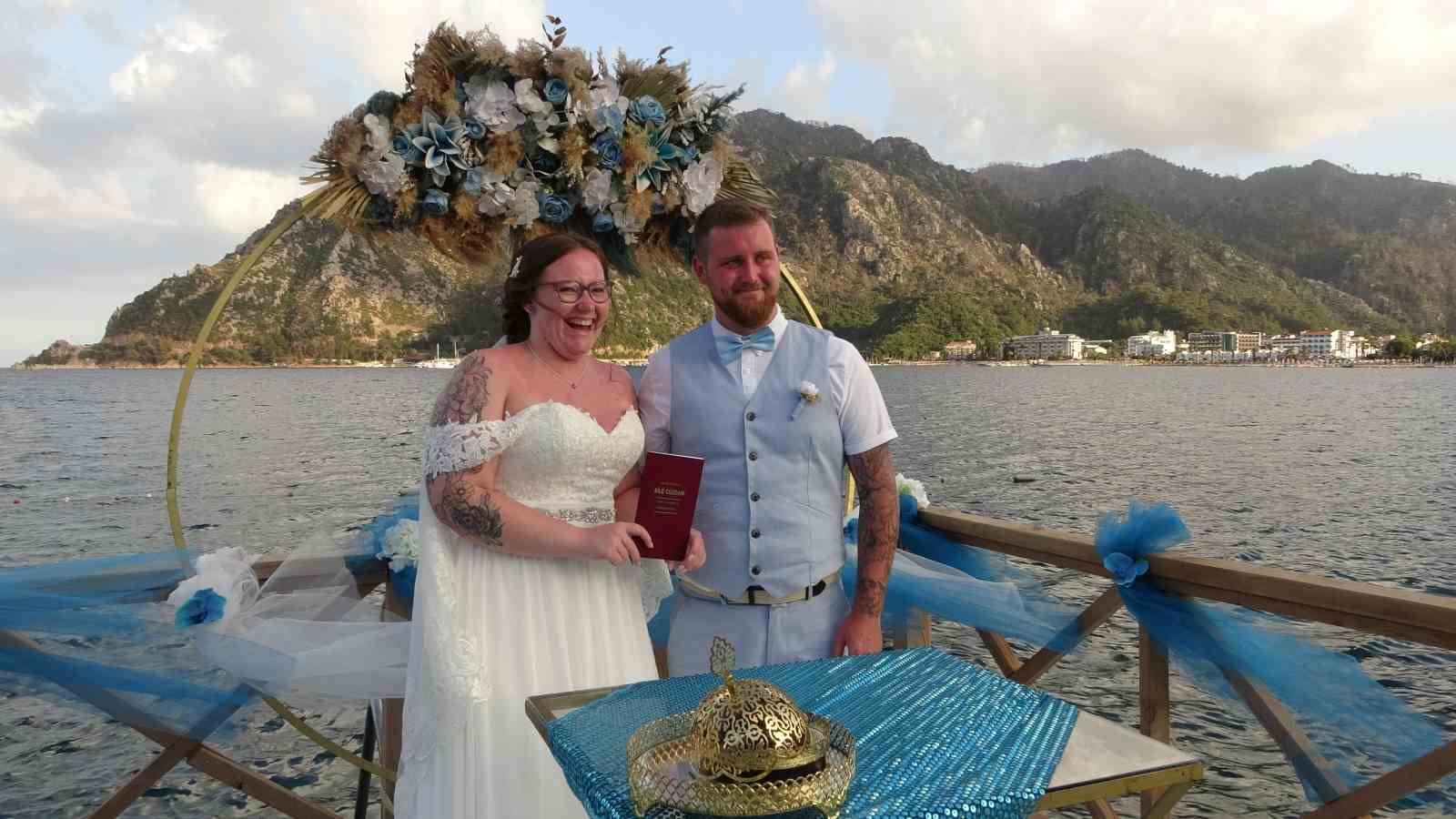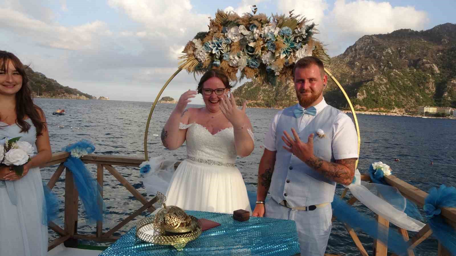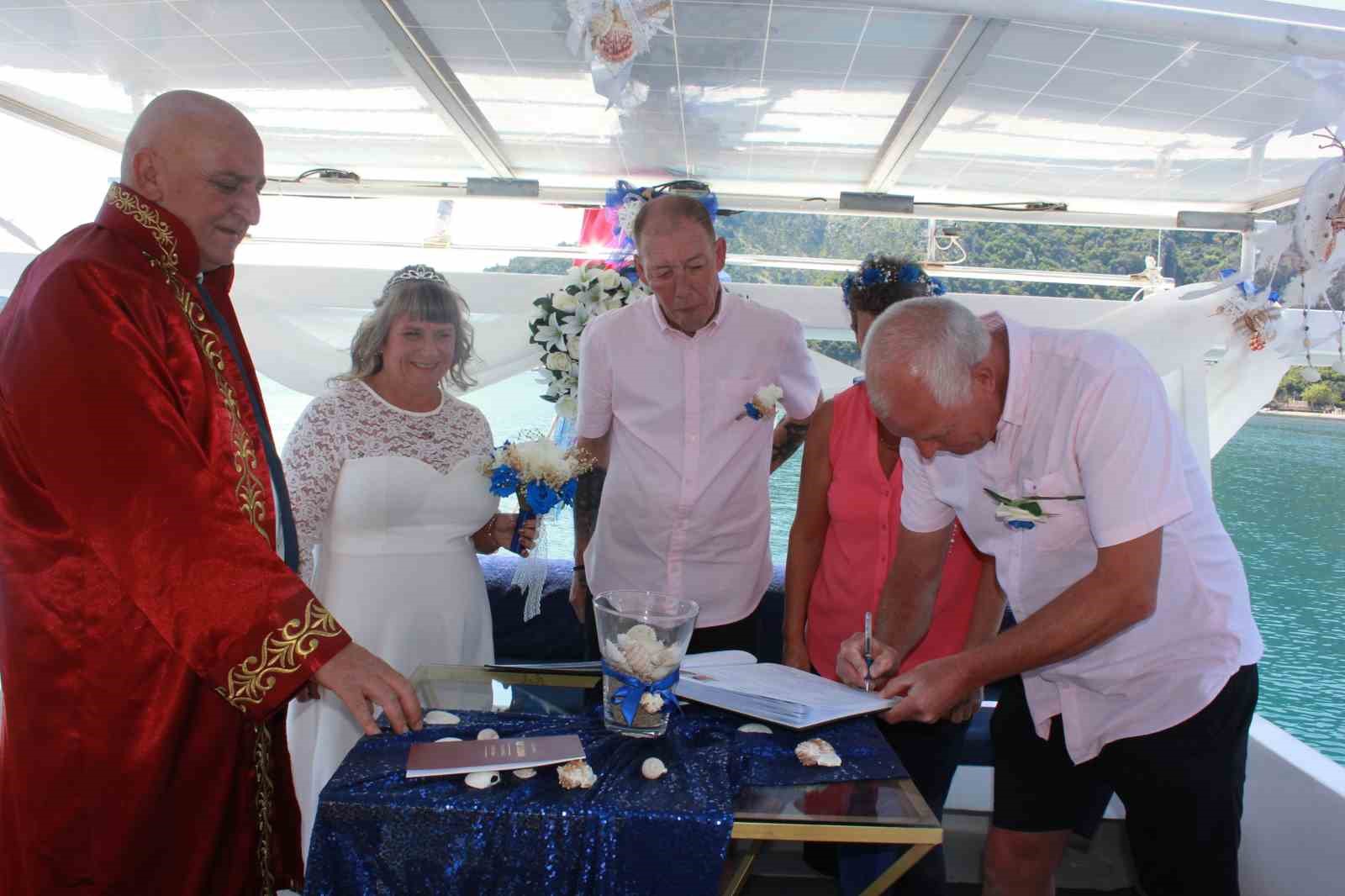 İçmeler Plajı’nda denizinin üzerindeki iskelede kıyılan nikahı Marmaris Belediye Başkanı Acar Ünlü adına Mahmut Mengili kıydı. Mengili nikah cüzdanının uluslararası olduğunu ve ülkelerinde gittikleri nüfus idaresinde kayıtlarını yaptırabileceklerini belirtti. Nikahın ardından yıllardır geldikleri İçmeler’de ki apart otelde düzenlenen düğün seremonisinde eğlencelerine devam eden aileler, sevdikleri ile birlikte olmaktan mutluluk duyduklarını ifade ettiler.