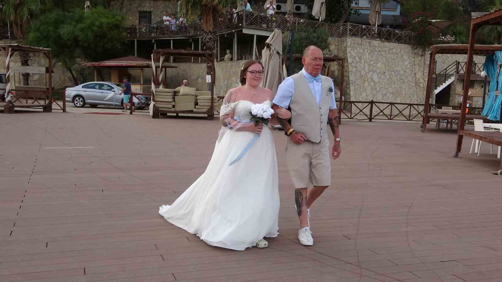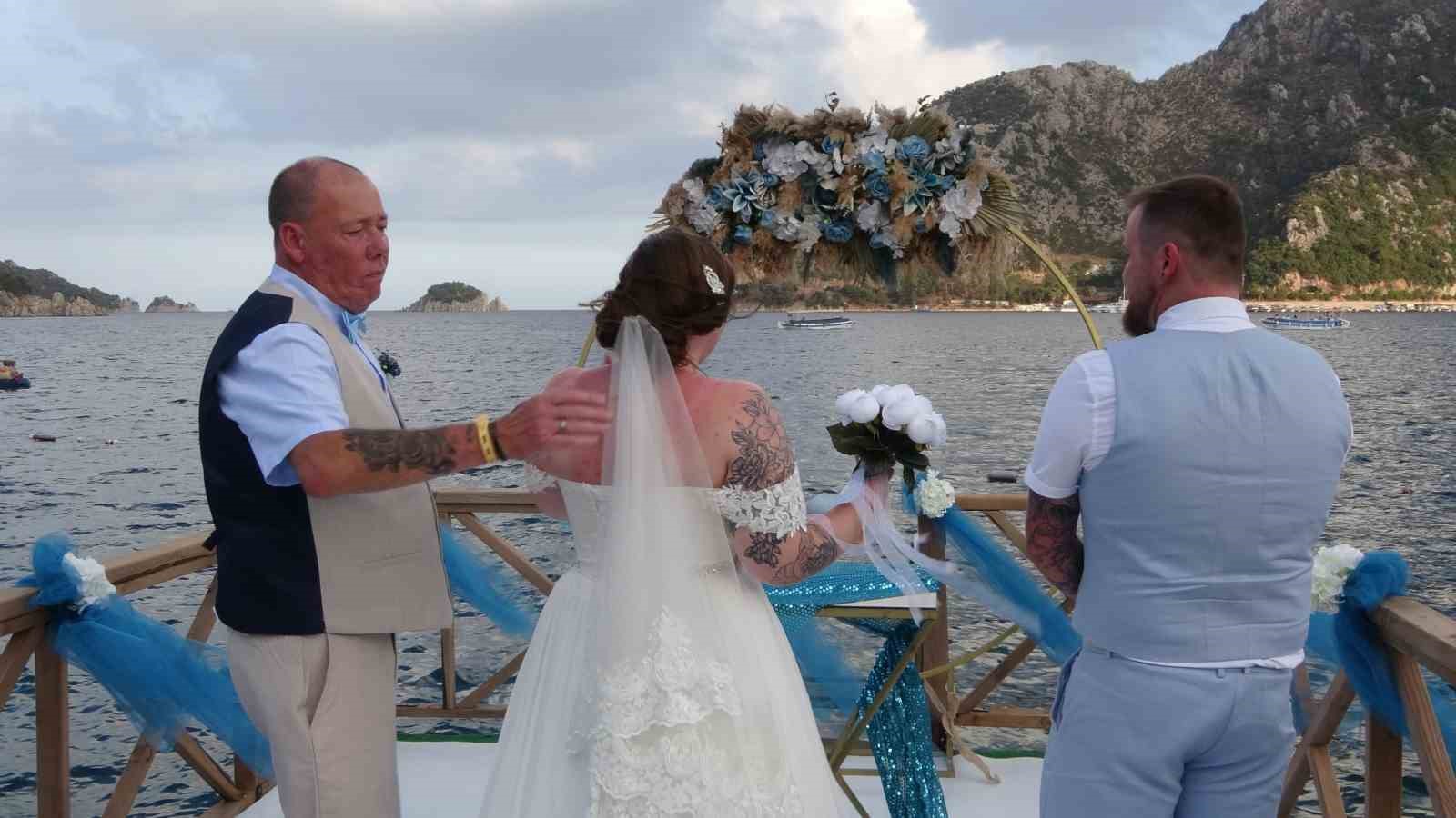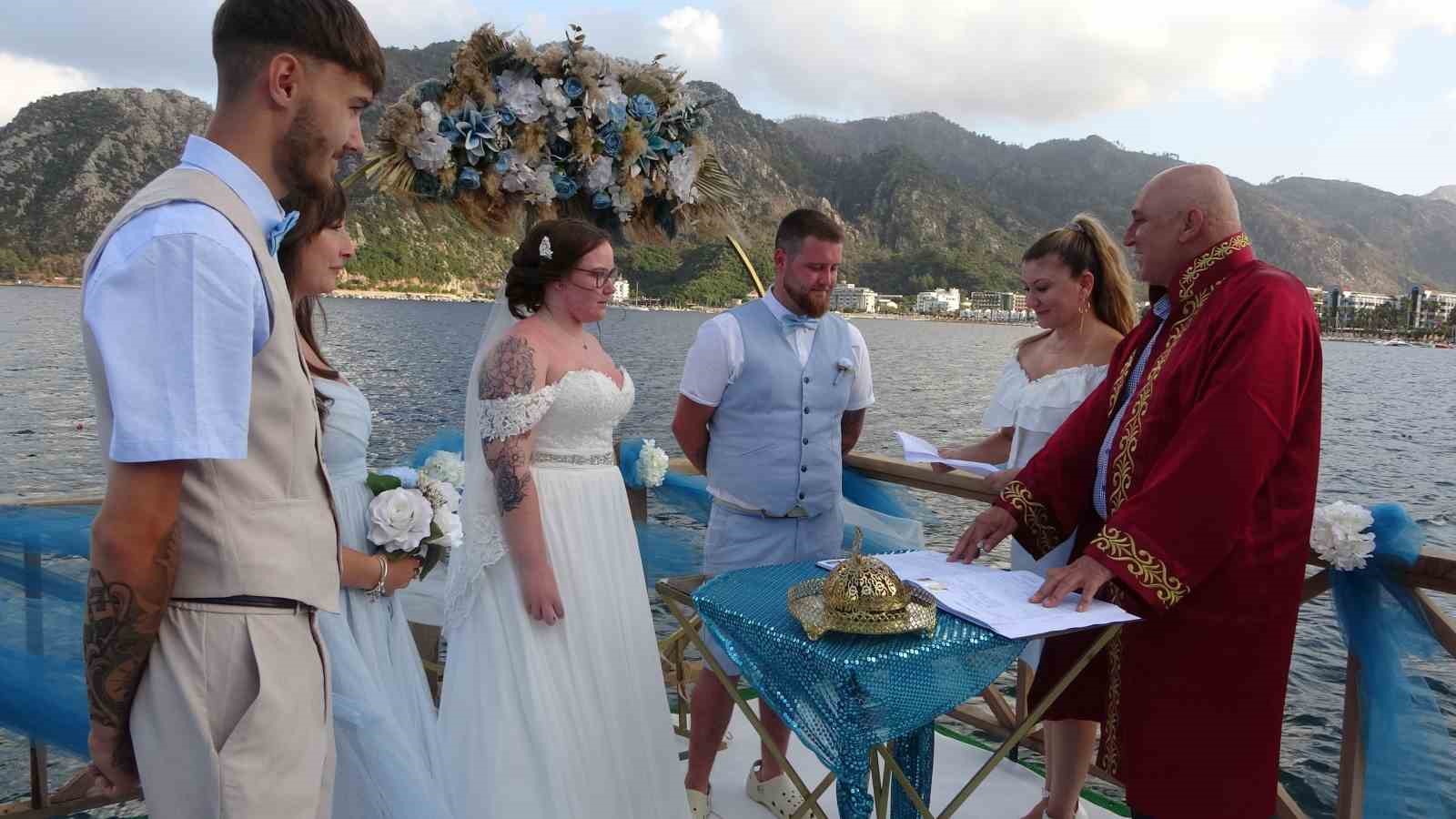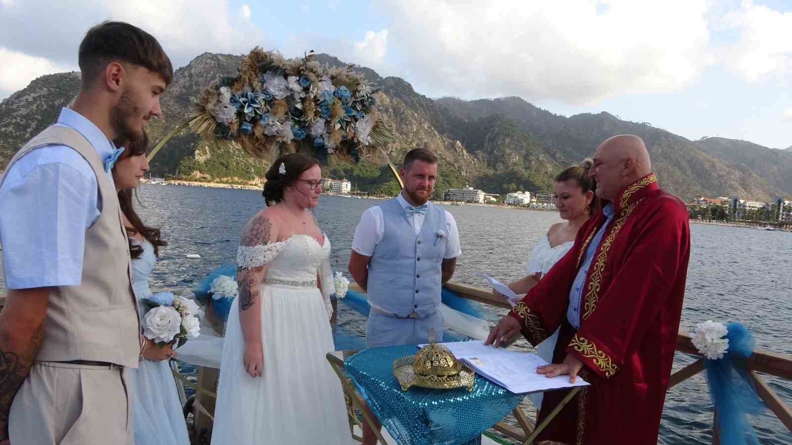 Marmaris’e 11 kilometre mesafedeki İçmeler Mahallesi plajında düzenlenen İngiltere’den gelin damadın aileleri ve arkadaşlarının katılımı ile düzenlenen nikah merasiminde 5 yıllık arkadaşlıklarını evlilik ile taçlandıran genç çift, birlikte çıktıkları ilk tatil olduğu için burada evlenmeyi tercih ettiklerini belirttiler. Babasının kolunda nikah masasına gelen gelini gören damat mutluluk gözyaşlarını tutamazken gelin Kate’in şen kahkahaları, arkadaşları ve ailelerini de mutlu etti.