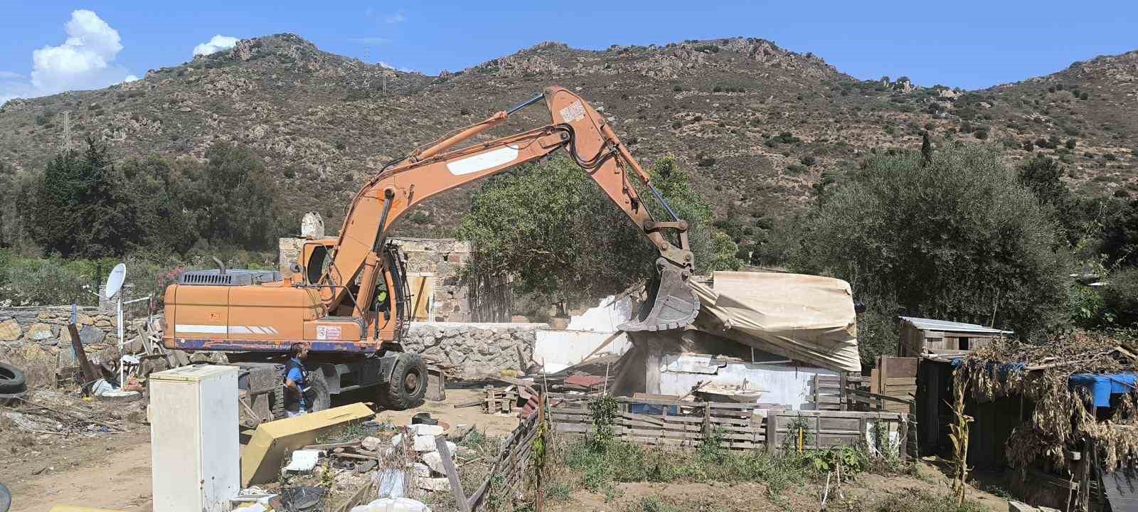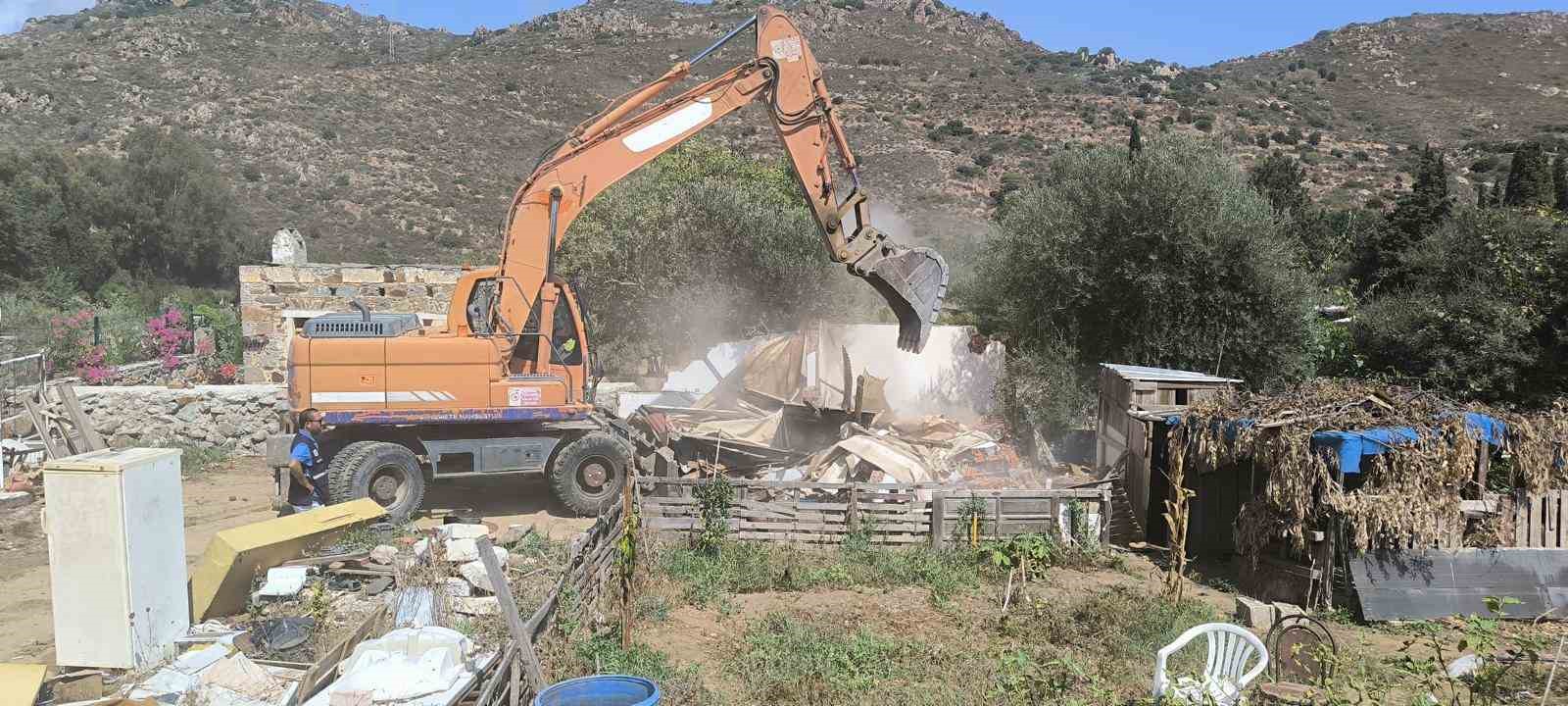 Muğla’nın Bodrum ilçesinde hazine arazisine yapılan kaçak yapı, ekiplerce yıkıldı. Araziye konulan minibüs kaldırıldı.