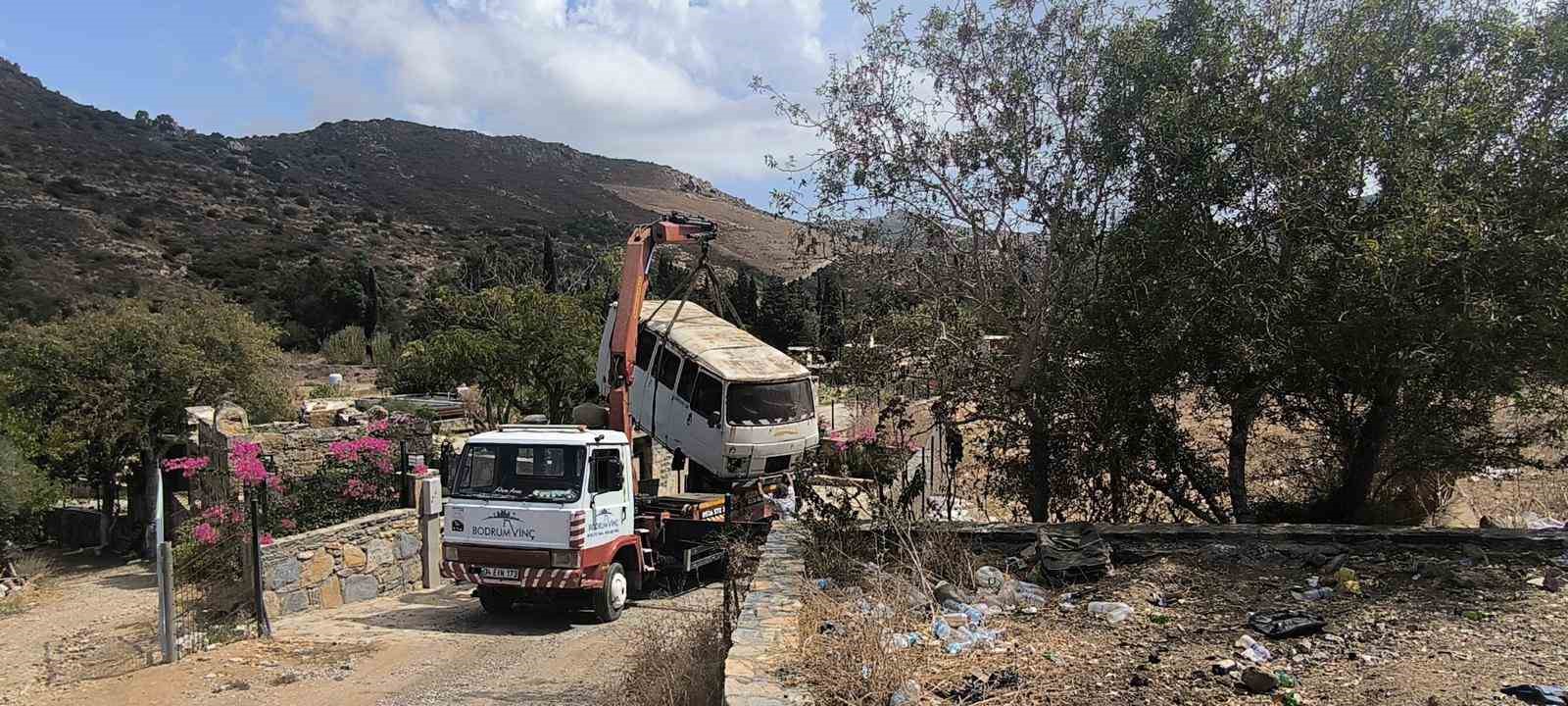 İhbarın ardından yapılan incelemeler sonunda yapı kayıt belgesi iptal edildi. Bodrum Kaymakamlığı Milli Emlak Müdürlüğü ve Bodrum Belediye ekipleri, bölgeye hareket etti. Ekipler, baraka ve eklentilerini yıktı. İçerisine çeşitli malzemeler konulan minibüs, vinç yardımıyla bölgeden kaldırıldı.
