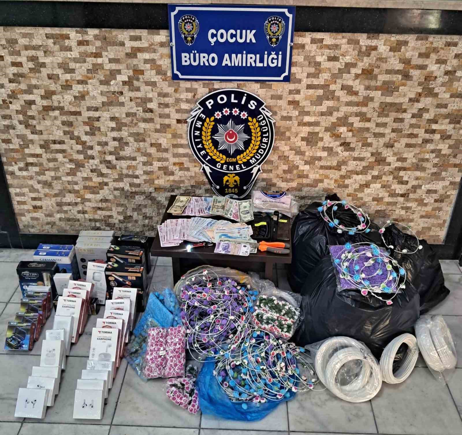 Eş zamanlı olarak arama yapılan adreslerde; kırmızı reçeteli 53 adet Galara 300 mg ibareli uyuşturucu nitelikli olarak değerlendirilen hap, taç satışı esnasında iletişim amaçlı kullanılan 1 adet ışıklı lazer cihazı, suçtan elde edildiği değerlendirilen 20 bin 404 TL, 210 pound, 50 Euro ve 42 dolar, plastik tel üzerine çiçek desenleri ile sarılı sokakta yaşı küçük çocuklara sattırılan çok sayıda taç, siyah poşet içerisinde faturasız ve gümrük kaçağı olduğu değerlendirilen 12 adet farklı marka modellerde şarjlı tıraş makinesi, 29 adet farklı marka modellerde faturasız ve gümrük kaçağı olarak değerlendirilen elektronik kablosuz kulaklık, plastik tel üzerine çiçek desenleri ile sarılı sokakta yaşı küçük çocuklara sattırılan çok sayıda taç muhafaza altına alındı.
