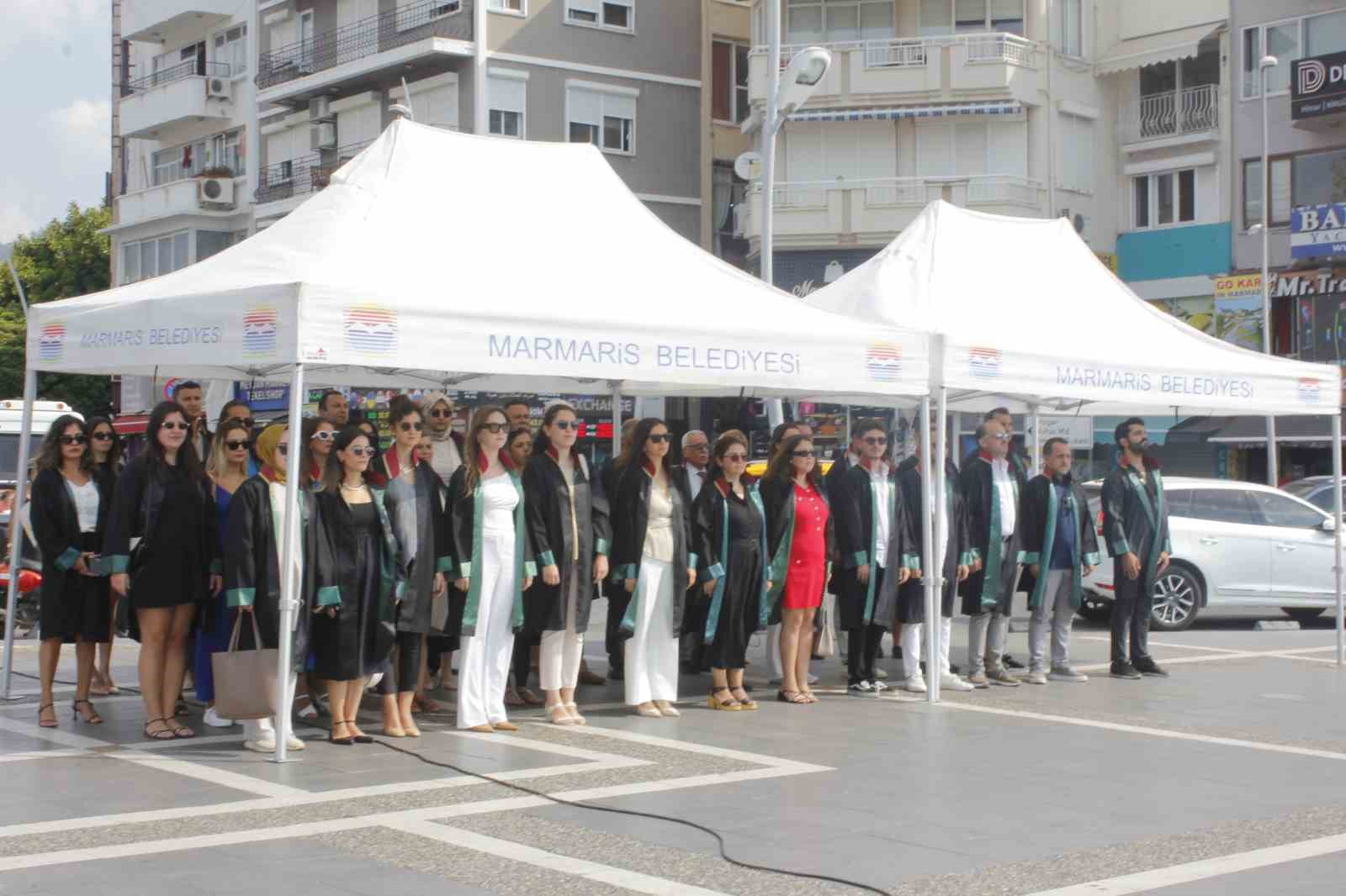 2024-2025 Adli Yıl Açılış Programı, 1 Eylül itibariyle sona eren adli tatilin ardından Marmaris’te düzenlenen törenle kutlandı. Tören, Muğla Barosu Marmaris İlçe Temsilciliği’ne bağlı avukatların Atatürk Meydanı’nda gerçekleştirdiği etkinliklerle başladı. Program kapsamında, tüm şehitler ve kaybettiğimiz gaziler anısına bir dakikalık saygı duruşu gerçekleştirildi, ardından İstiklal Marşı okundu. Muğla Barosu Marmaris İlçe Temsilcisi Avukat Buğra Yavuz ve temsilci yardımcısı Avukat Cemal Akdoğan’ın Atatürk anıtına çelenk sunumu ile devam eden programda Avukat Buğra Yavuz günün anlam ve önemine binaen konuşma yaptı.