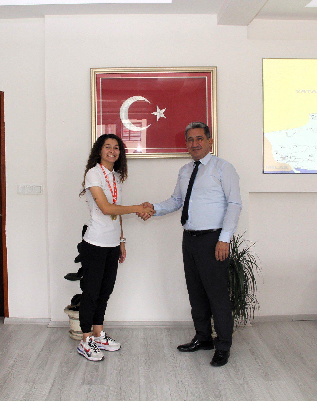 Menteşe Cumhuriyet Ortaokulu Beden Eğitimi Öğretmeni ve aynı zamanda Muğla Ortaca Spor Kulübü Hentbol Takımı kaptanı olan Milli sporcu Ayşenur Çankaya, Menteşe İlçe Milli Eğitim Müdürü İdris Kömürcü ile görüştü.