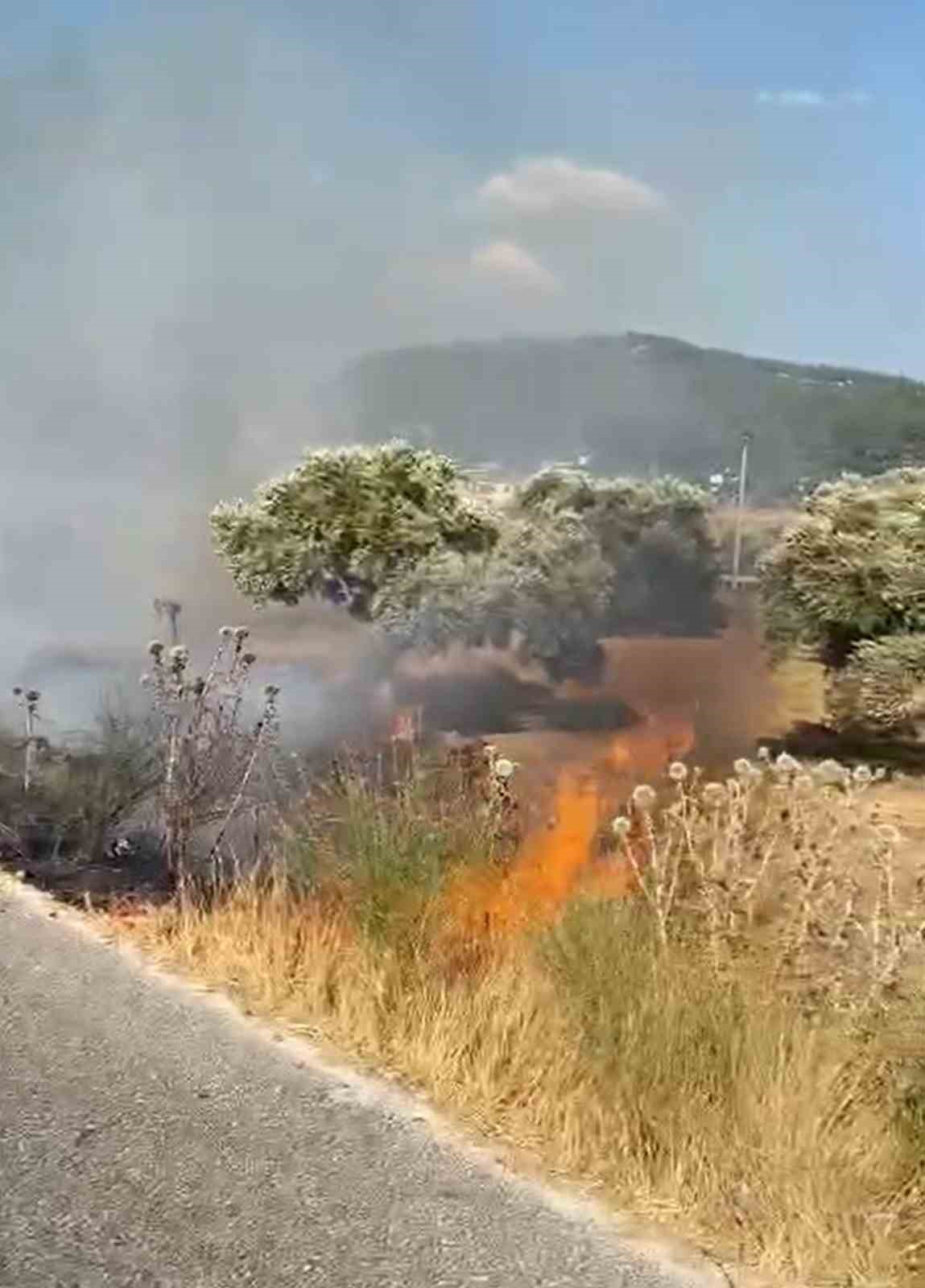 Karayolu kenarında başlayan yangında yol kenarındaki otlar ile zeytinlik alanda bazı zeytin ağaçları alevlerden zarar gördü. Ekiplerin yangını söndürme çalışmaları devam ediyor.