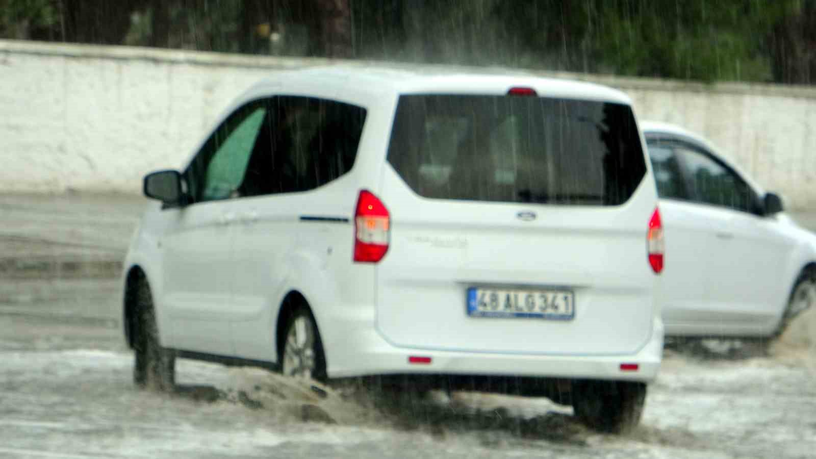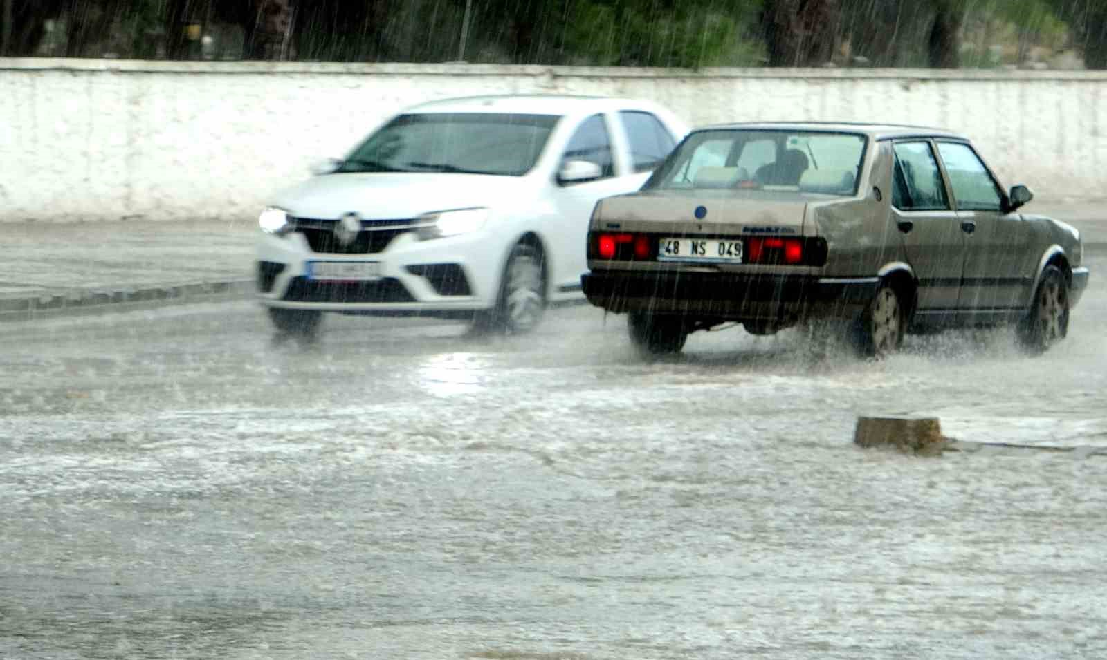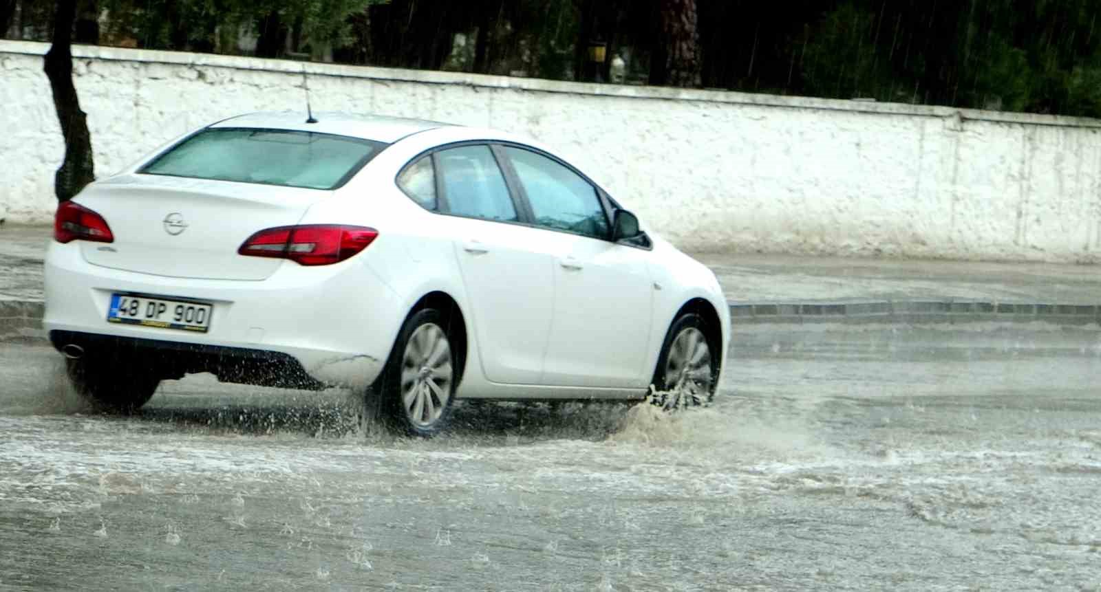 Meteoroloji Genel Müdürlüğü‘nün yağış uyarısını ardından Muğla’da öğle saatlerinde başlayan yağış kısa sürede caddeleri yağmur suyu kapladı ve sürücüler zor anlar yaşadı.