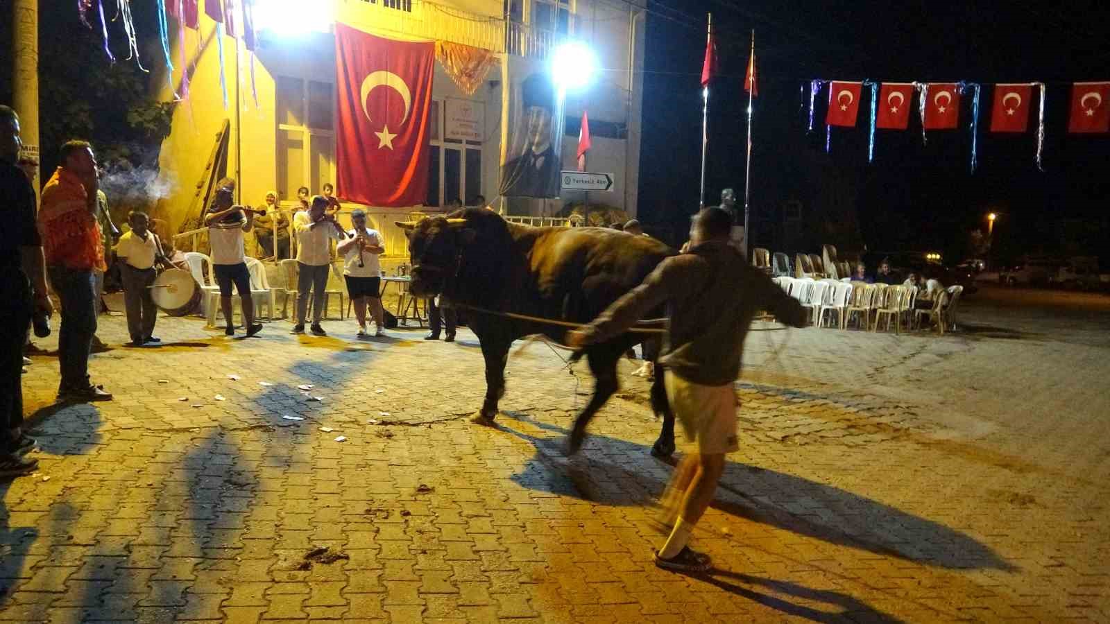 Menteşe ilçesi Algı Mahallesi’nde bu yıl 10’uncusu düzenlenecek boğa güreşi etkinliği öncesi görücüye çıkarılan boğalar, renkli ve heyecan dolu anlara sahne oldu. Köy meydanında davul zurna eşliğinde boğalar piste çıktığında, boğa sahipleri ve yakınları yanlarında getirdikleri paraları havaya savurarak etkinliğe katılanların dikkatini çekti. İzleyiciler, bu anları büyük bir heyecanla izledi ve pehlivan boğaları hayranlıkla takip etti. Ancak boğaların agresif ve güçlü yapıları nedeniyle davulcular paraları toplamakta zorlandı. Boğaların yanına yaklaşamayan davulcular, güvenlik endişesiyle piste atılan paraları toplayamadı.