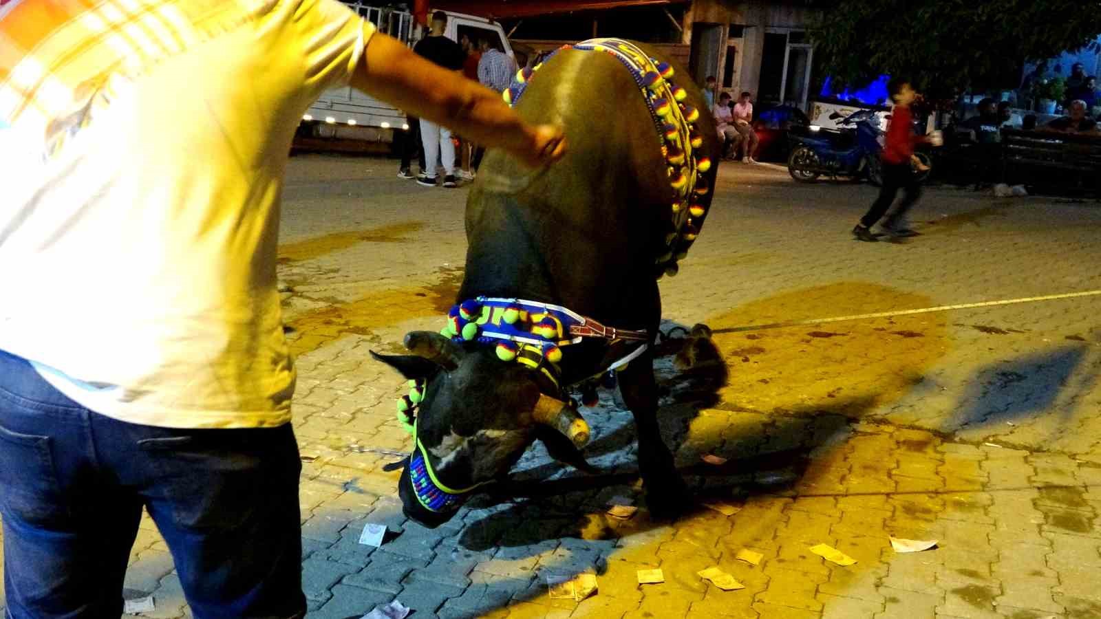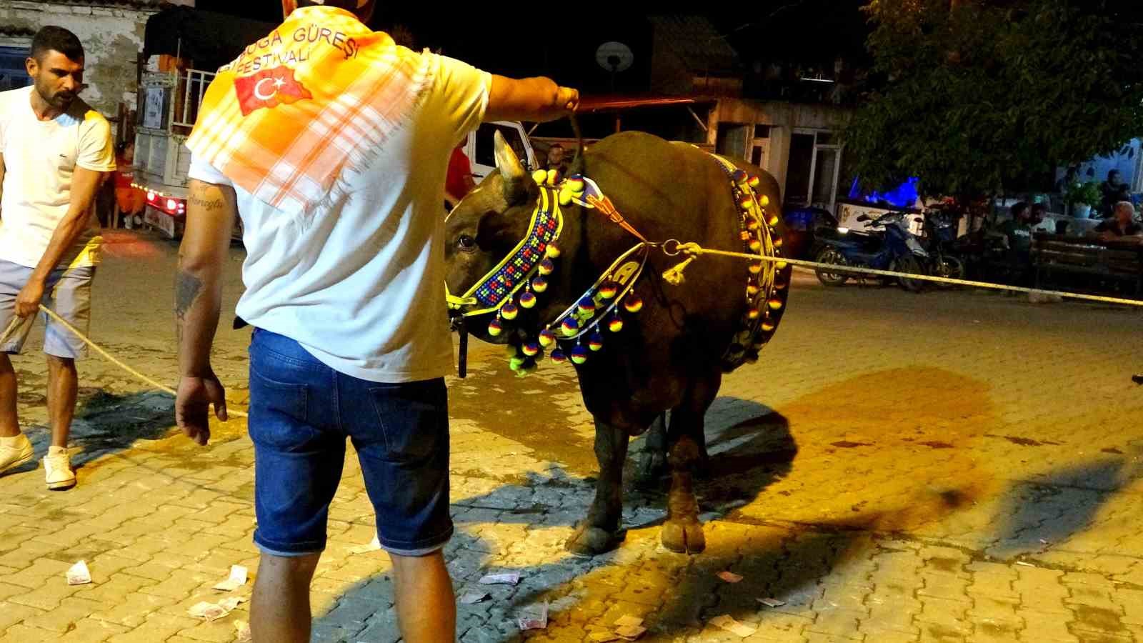Muğla’nın Menteşe ilçesine bağlı Algı Mahallesi’nde 10’uncusu düzenlenecek boğa güreşi öncesinde davul zurna eşliğinde görücüye çıkan boğalar para yağmuruna tutuldu. Boğacılar, deste deste savurdukları paralarla büyük ilgi çekerken, boğaların yanına yaklaşmaya korkan davulcular ise bu paraları toplayamadı.