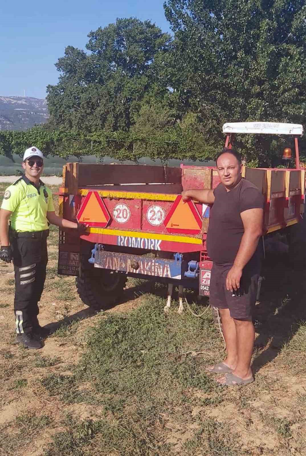 Tarımsal faaliyetlerin yoğun olarak yaşandığı bölgelerdeki yollarda seyreden traktörler için Muğla Emniyet Müdürlüğü Trafik Tescil ve Denetleme Şube Müdürlüğü ekipleri hem denetim yapıyor, hem de reflektörü olmayan traktörlerin römorklarına reflektör hediye ediyor.