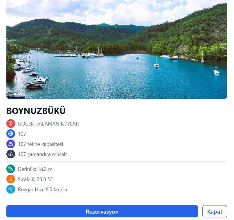Tekne tanımlandıktan sonra rezervasyon adımına geçiliyor. Giriş ve çıkış tarihleri belirleniyor, harita üzerinden koy seçiliyor. Sistem toplam tutarı gün sayısı ve KDV’ye göre otomatik hesaplıyor. Kart bilgileri girildikten sonra ödeme tamamlandığında rezervasyon kesinleşiyor. Ödeme yapılmadan rezervasyon aktif olmuyor; 15 dakika içinde ödeme gerçekleşmezse sistem rezervasyonu iptal ediyor. Tüm rezervasyonlar daha sonra “Rezervasyonlarım” ekranından yönetilebiliyor; aktif, gelecek, geçmiş ve iptal edilmiş tüm işlemler bu ekranda listeleniyor.